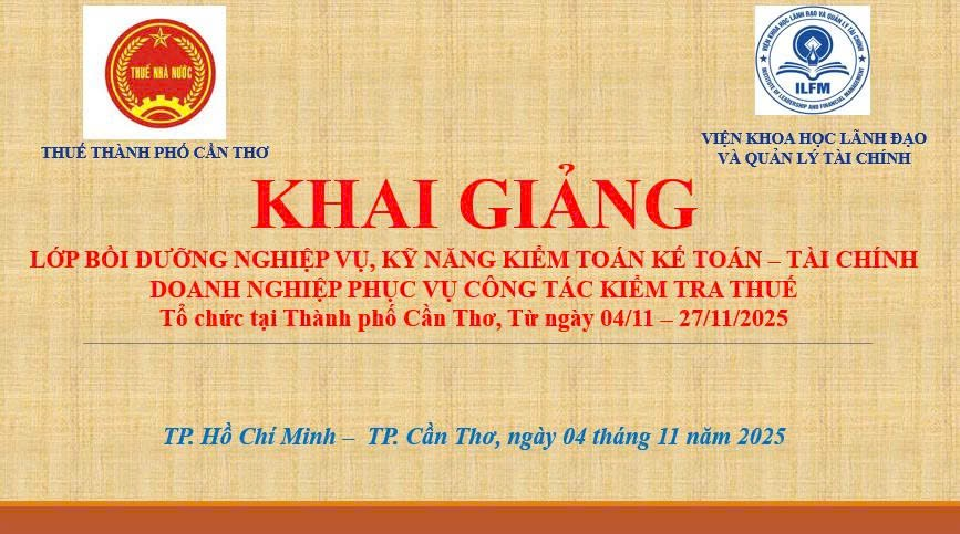 Tối ngày 04/11/2025, Viện Khoa học Lãnh đạo và Quản lý Tài chính phối hợp với Thuế thành phố Cần Thơ tổ chức Khai giảng Lớp “Bồi dưỡng nghiệp vụ, kỹ năng Kiểm toán kế toán – tài chính doanh nghiệp phục vụ công tác kiểm tra thuế” cho 61 công chức.