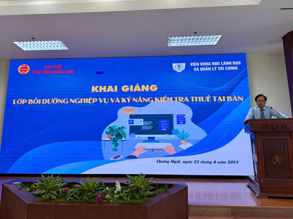 Sáng ngày 22/8/2025, tại Hội trường Thuế tỉnh Quảng Ngãi (số 507 Quang Trung, phường Cẩm Thành, tỉnh Quảng Ngãi), Viện Khoa học Lãnh đạo và Quản lý Tài chính phối hợp với Thuế tỉnh Quảng Ngãi đã long trọng tổ chức Lễ Khai giảng lớp Bồi dưỡng nghiệp vụ và kỹ năng kiểm tra thuế tại bàn cho đội ngũ công chức ngành Thuế trên địa bàn tỉnh. Buổi lễ diễn ra trong không khí trang trọng, với sự tham dự của nhiều đại biểu lãnh đạo và khách mời quan trọng.
