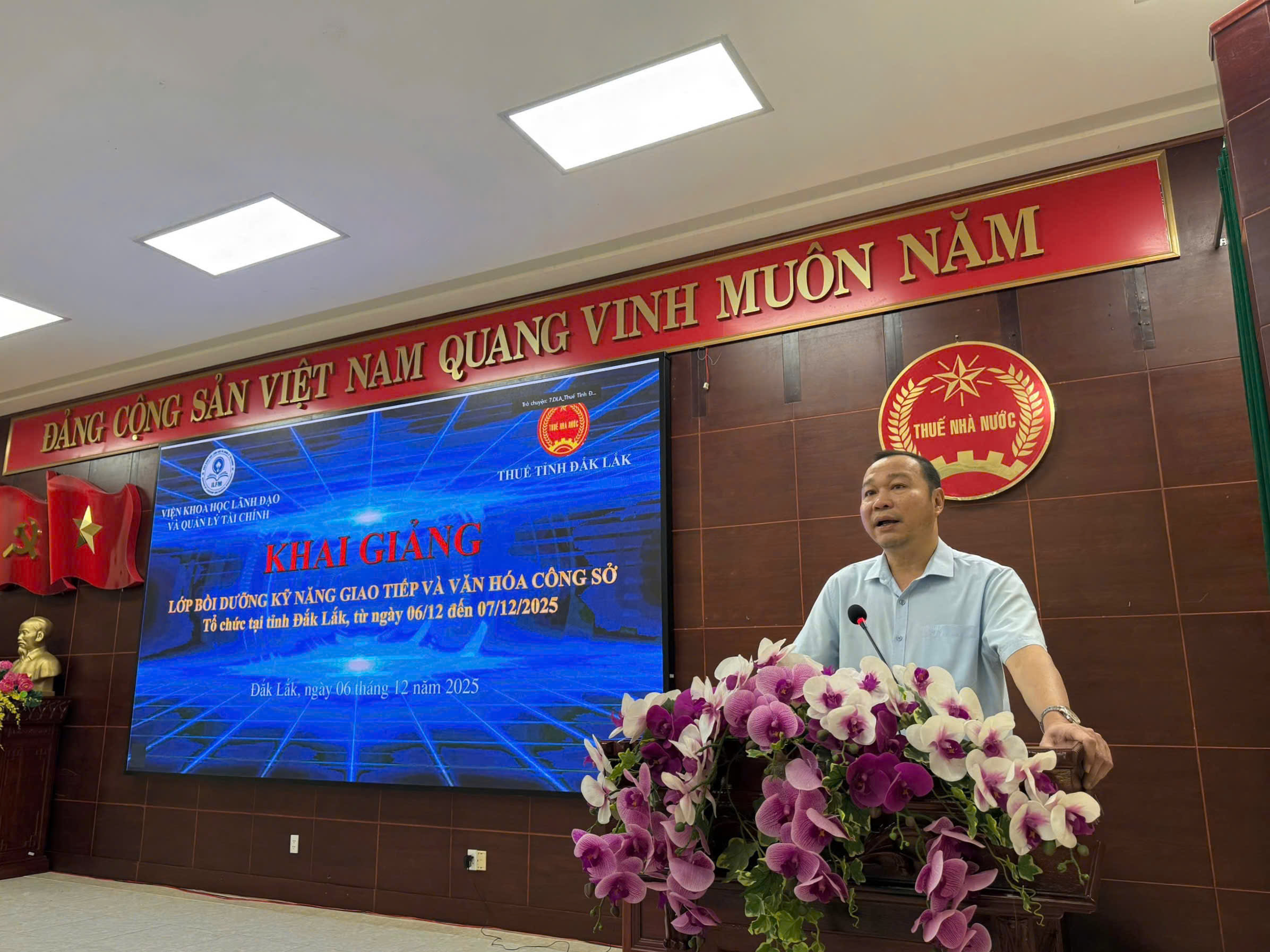 Sáng ngày 06/12/2025, Viện Khoa học Lãnh đạo và Quản lý Tài chính phối hợp với Thuế tỉnh Đắk Lắk tổ chức Lễ Khai giảng Lớp Bồi dưỡng Kỹ năng giao tiếp và Văn hoá công sở dành cho đội ngũ lãnh đạo và công chức toàn ngành Thuế tỉnh. Buổi khai giảng diễn ra theo hình thức học tập trung tại trụ sở Thuế tỉnh và kết nối trực tuyến đến 8 điểm cầu Thuế cơ sở, với sự tham dự của 630 đại biểu, lãnh đạo và công chức.
